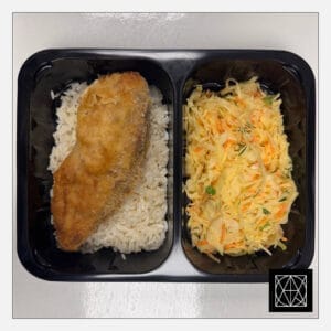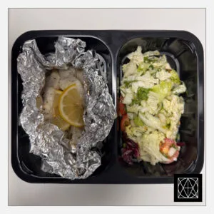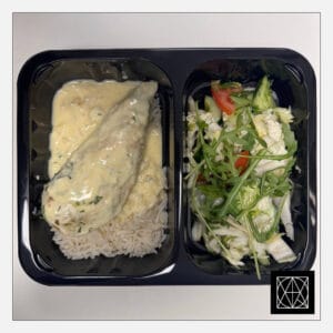 Ledjūrio menkė su alyvuogių tapenada, pateikiama su laukiniais ryžiais ir šviežiomis salotomis