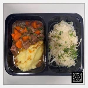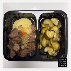 Jautienos befstrogenas, pateikiamas su sviestine bulvių koše ir marinuotais agurkais