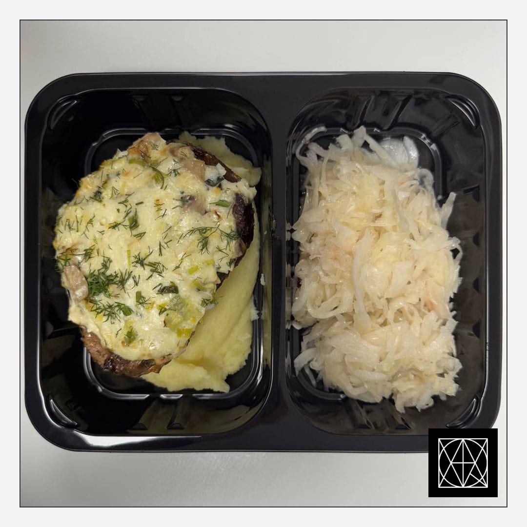 Bajoriškas kiaulienos kepsnys, užkeptas grybais ir šonine, pateikiamas su bulvių koše ir mūsų raugintais kopūstais, gardintais aliejumi ir svogūnėliais
