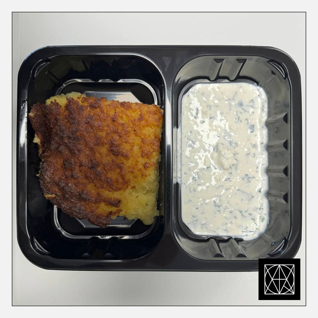 produkto kiekis: Bulvių plokštainis, pateikiamas su varškės kremu