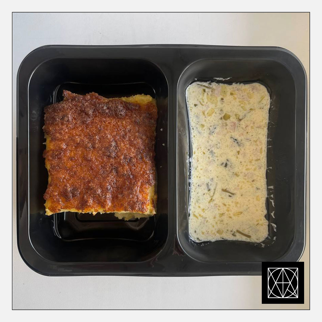 produkto kiekis: Bulvių plokštainis su grietinės-šoninės padažu