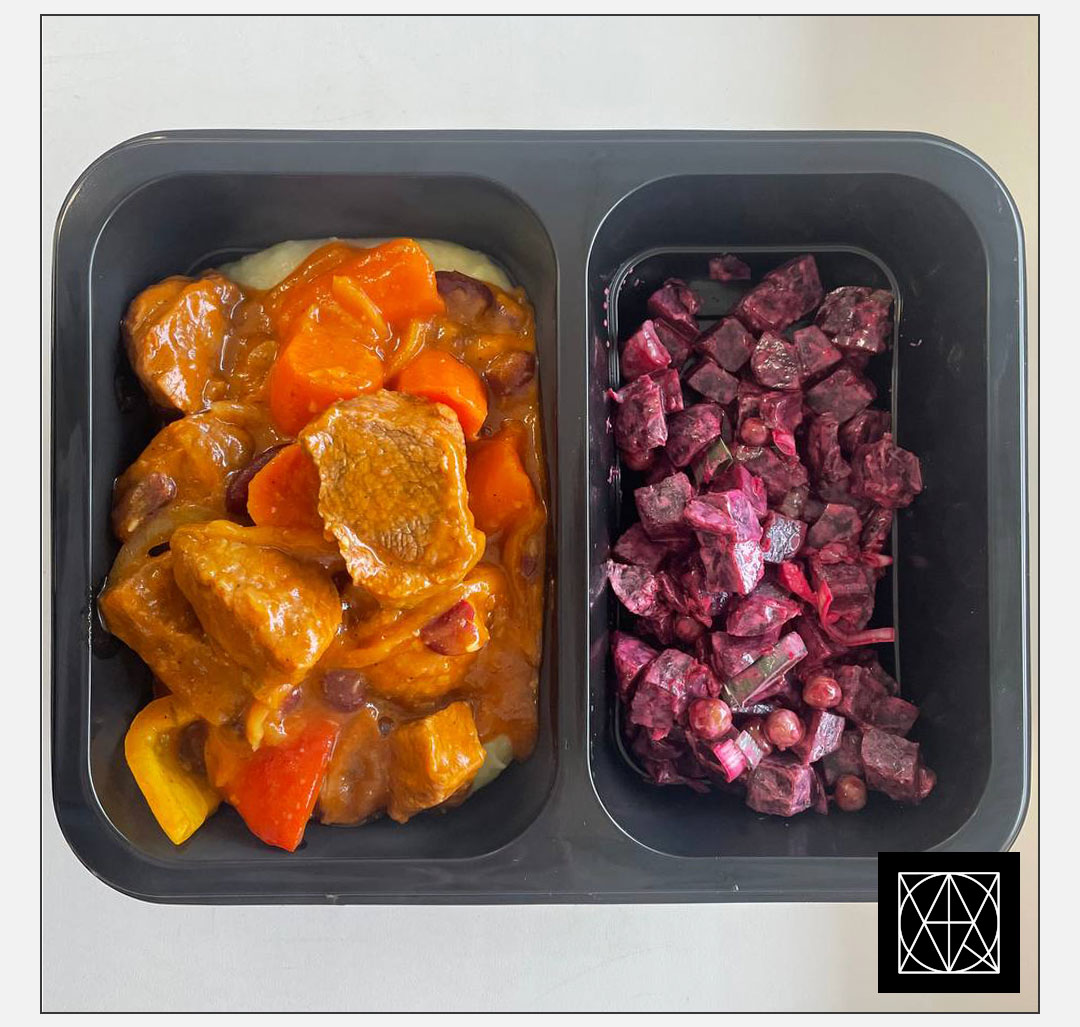 produkto kiekis: Burgundiškas jautienos troškinys, pateikiamas su sviestine bulvių koše ir burokėlių salotomis, gardintomis majonezu