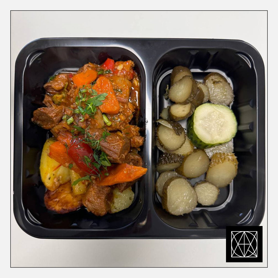 Burgundiškas jautienos troškinys, pateikiamas su keptomis bulvėmis ir šviežiai raugintais agurkais