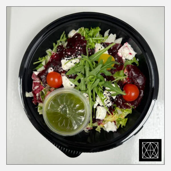Burokėlių karpačio su ožkos sūriu, pagardintas karamelizuotomis kriaušėmis ir žaliuoju pesto padažu