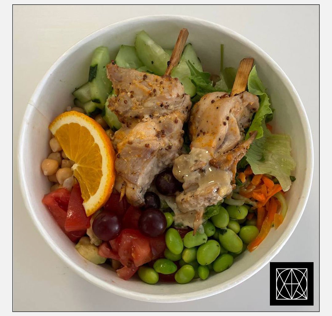 Chicken Poke Bowl – vištienos iešmelis, ryžiai, daiginti avinžirniai, edamame pupelės, salotos, agurkai, marinuota paprika, sezamai, Cezario-ančiuvių padažas