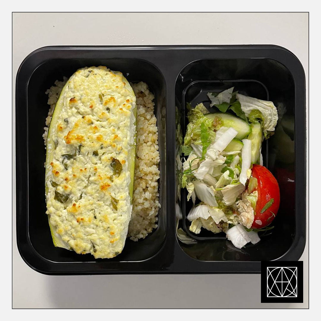 Cukinija, įdaryta varške ir špinatais, pateikiama su bulguru ir šviežiomis salotomis
