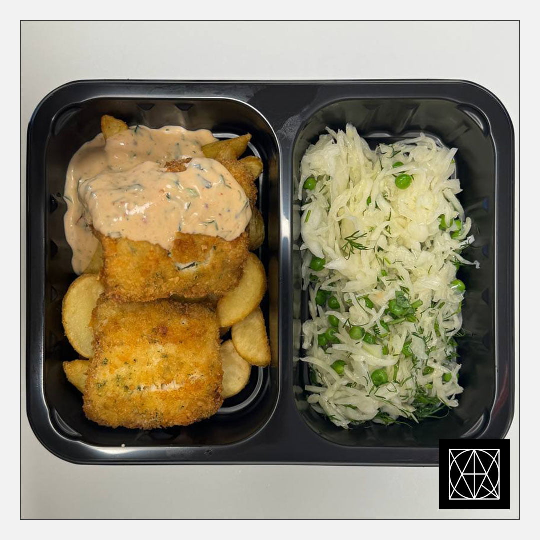 „Fish and chips“ – žuvis tešloje su gruzdintomis bulvytėmis, žuvies padažu ir kopūstų-žirnelių salotomis