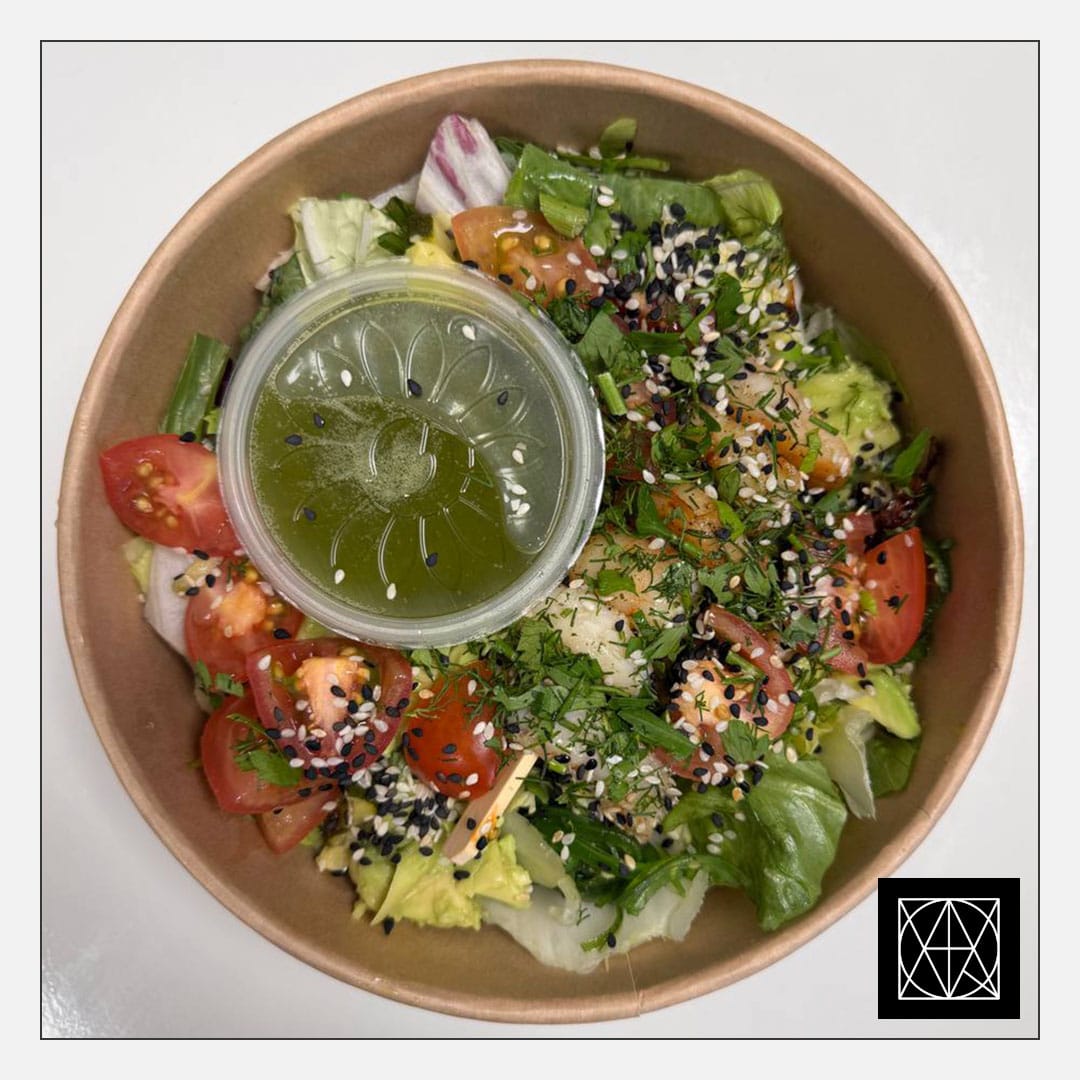 produkto kiekis: Gaivios avokadų salotos su keptomis krevetėmis, kepta cukinija, Wakame jūros dumbliais ir žaliuoju pesto padažu
