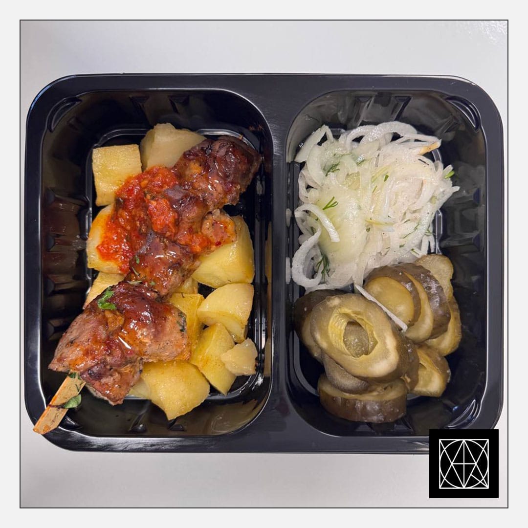 Kiaulienos sprandinės šašlykas su namine adžika, pateikiamas su keptomis bulvėmis, marinuotais agurkais ir lengvai marinuotais šalotiniais svogūnėliais