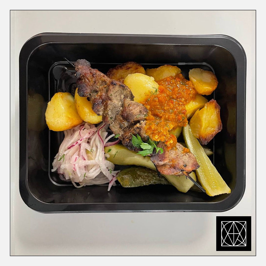 Grill kiaulienos šašlykas su adžika, pateikiamas su keptomis bulvių skiltelėmis su rozmarinu, marinuotais agurkais ir lengvai marinuotais šalotiniais svogūnais