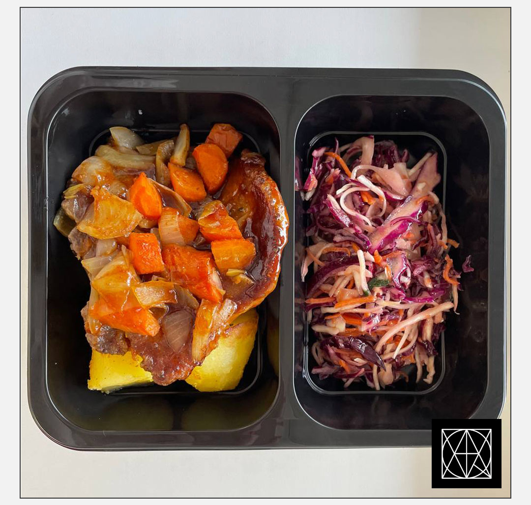 Grill kiaulienos sprandinės kepsnys, pateikiamas su keptomis bulvėmis ir „Coleslaw“ salotomis