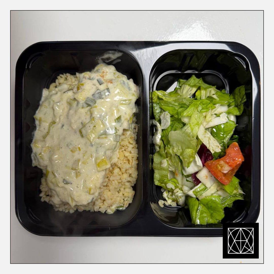 Hoki filė kepsnys su porų-grietinėlės padažu, pateikiamas su bulguru ir šviežiomis salotomis
