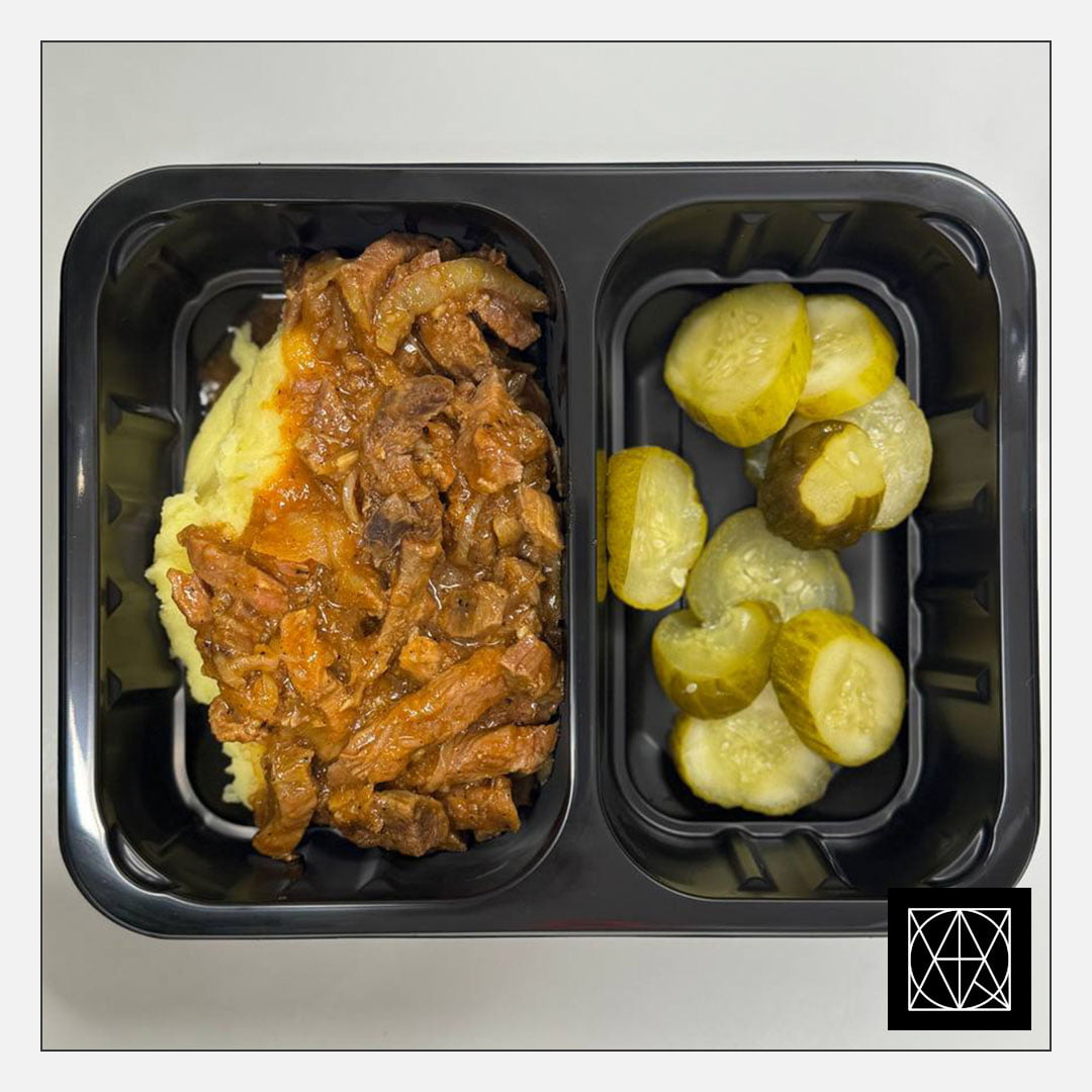 produkto kiekis: Jautienos befstrogenas, pateikiamas su sviestine bulvių koše ir marinuotais agurkais