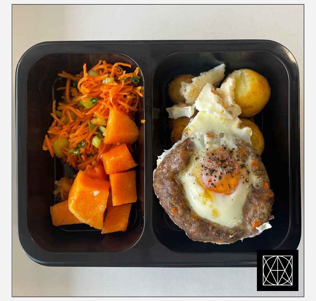 Jautienos bifšteksas su keptu kiaušiniu, pateikiamas su keptomis bulvėmis ir morkų-moliūgų salotomis