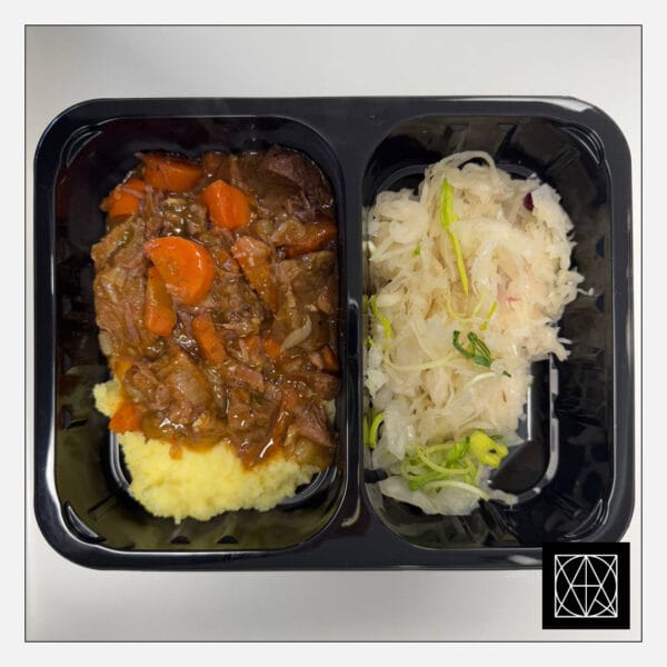 Jautienos guliašas, pateikiamas su sviestine bulvių koše ir mūsų raugintais kopūstais, gardintais aliejumi ir svogūnėliais