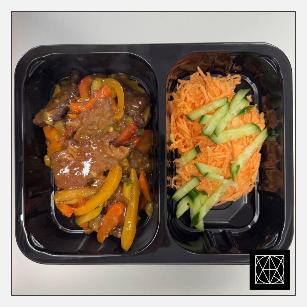 Jautienos juostelės su azijietiškomis daržovėmis, pateikiamos su keptomis česnakinėmis bulvėmis ir morkų salotomis, gardintomis agurkais
