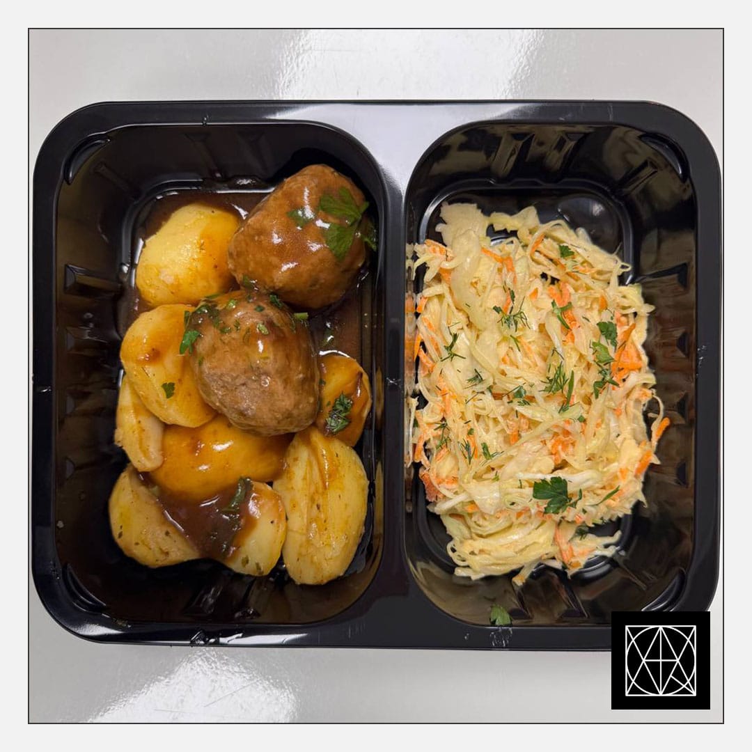 Jautienos kukuliai su „Poivrade“ padažu, pateikiami su keptomis bulvėmis ir kopūstų salotomis, gardintomis majonezu