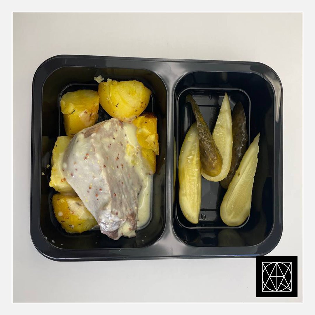 Jautienos liežuvis garstyčių padaže, pateikiamas su keptomis bulvėmis ir marinuotais agurkais