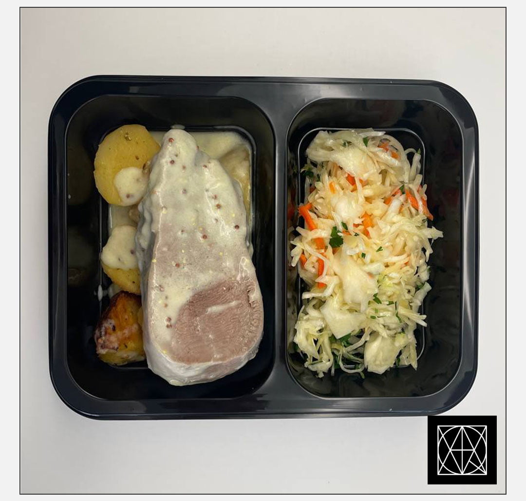Jautienos liežuvis garstyčių padaže, pateikiamas su keptomis bulvėmis ir marinuotais kopūstais