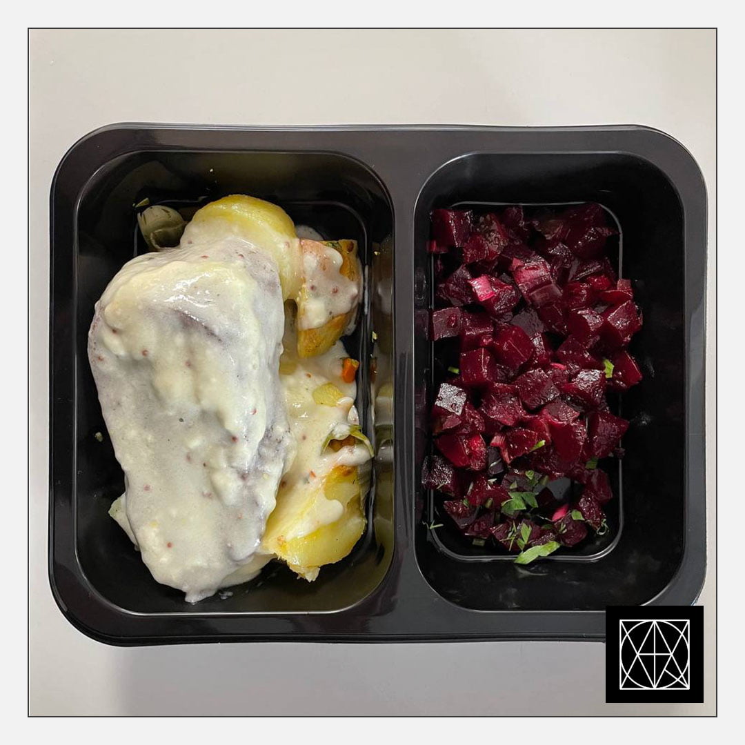 Jautienos liežuvis garstyčių padaže, pateikiamas su keptomis bulvėmis ir burokėlių salotomis
