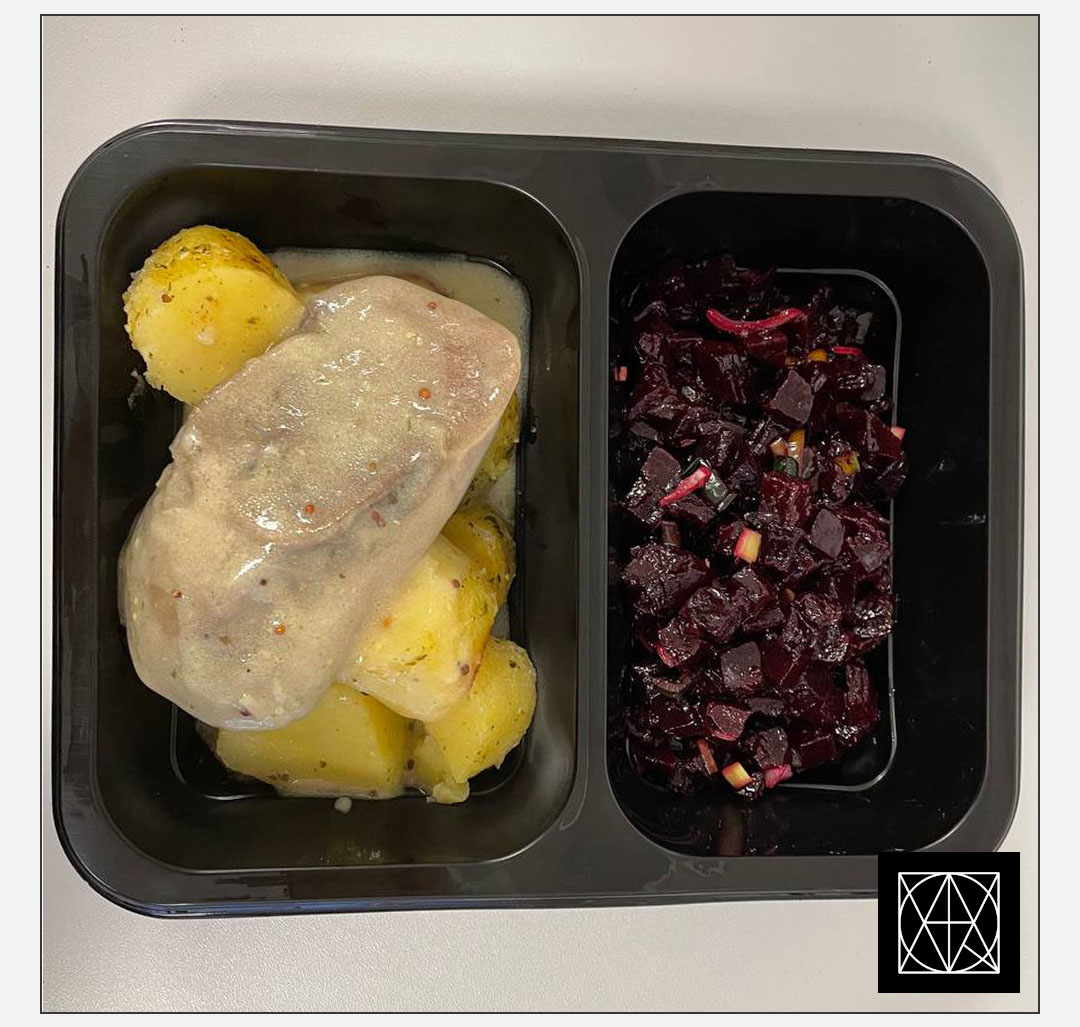 Jautienos liežuvis grūdėtų garstyčių padaže, pateikiamas su keptomis bulvėmis ir burokėlių salotomis
