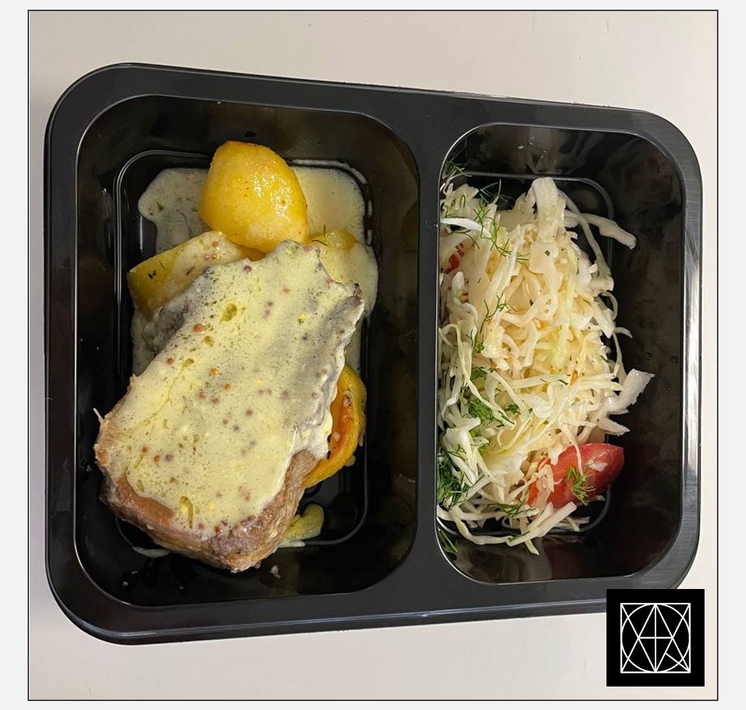 Jautienos liežuvis grūdėtų garstyčių padaže, pateikiamas su keptomis bulvėmis ir kopūstų-pomidorų salotomis