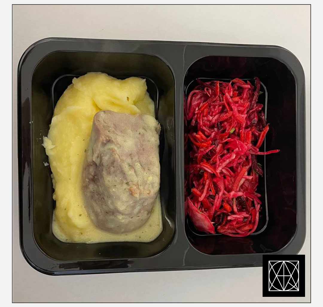 Jautienos liežuvis krienų padaže, pateikiamas su bulvių koše ir „Coleslaw“ salotomis