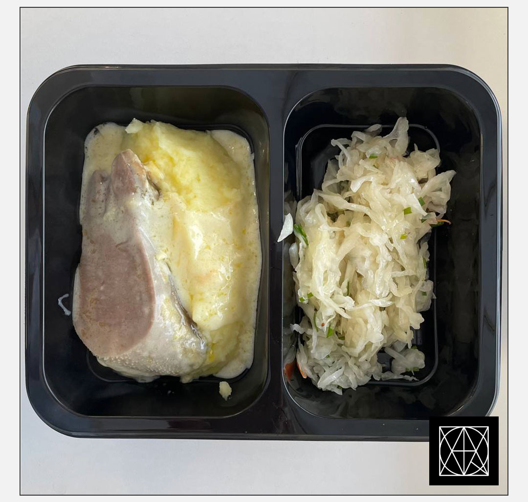 Jautienos liežuvis krienų padaže, pateikiamas su bulvių koše ir mūsų ūkio raugintais kopūstais