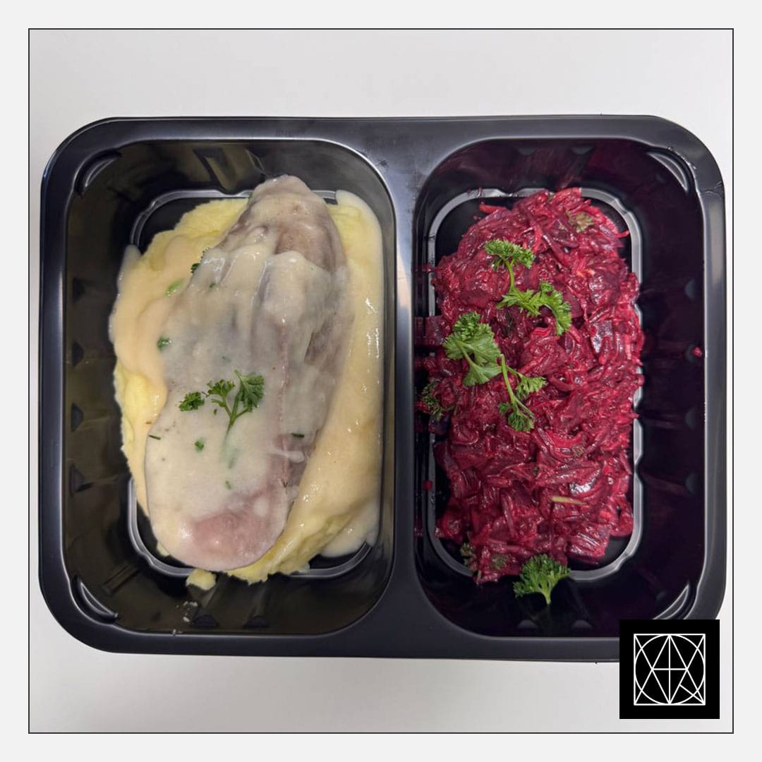 Jautienos liežuvis su krienų padažu, pateikiamas su sviestine bulvių koše ir burokėlių salotomis, gardintomis majonezu