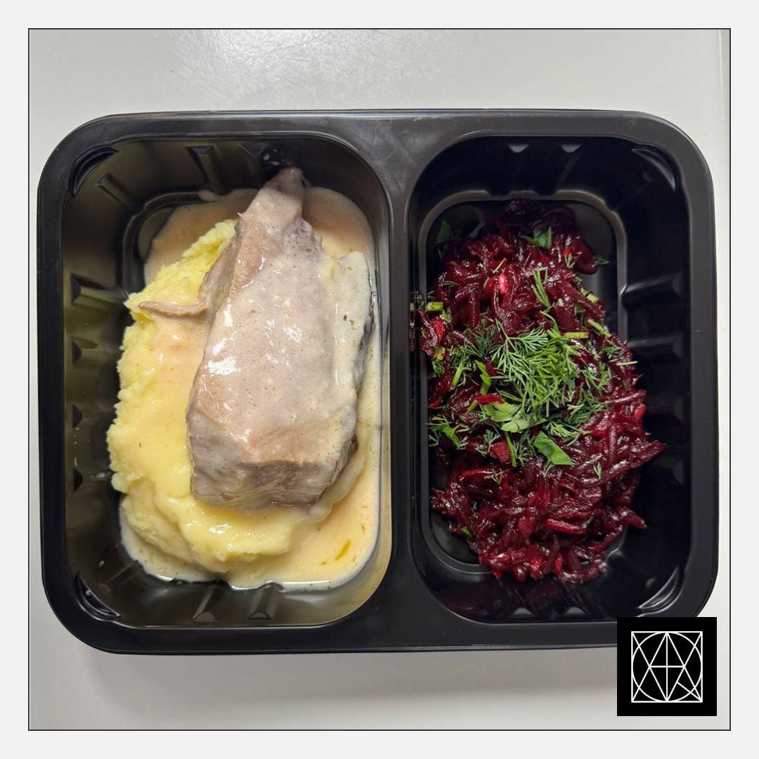 Jautienos liežuvis su raudonųjų krienų padažu, pateikiamas su bulvių koše ir burokėlių salotomis, gardintomis svogūnų laiškais