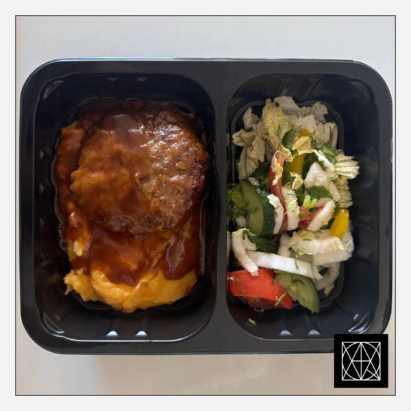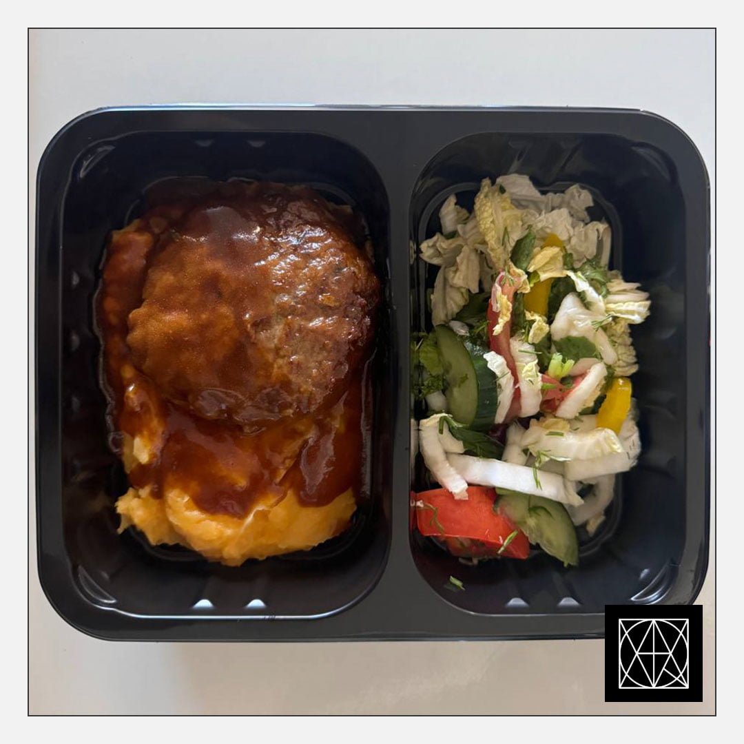 Jautienos maltinis su „Poivrade“ padažu, pateikiamas su bulvių-moliūgų koše ir šviežiomis salotomis