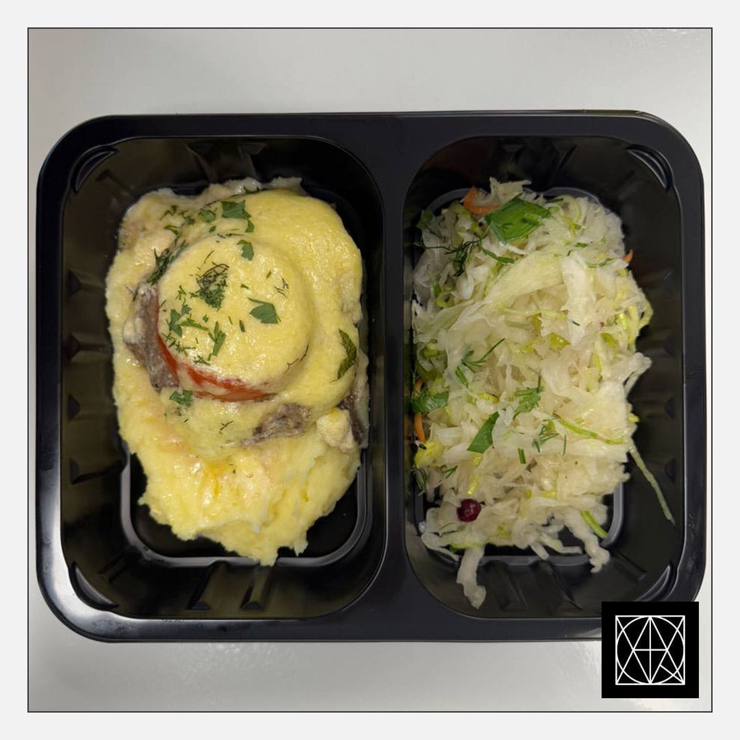 Jautienos maltinis, užkeptas pomidoru ir sūriu, pateikiamas su sviestine bulvių koše ir mūsų raugintais kopūstais, gardintais aliejumi ir svogūnėliais