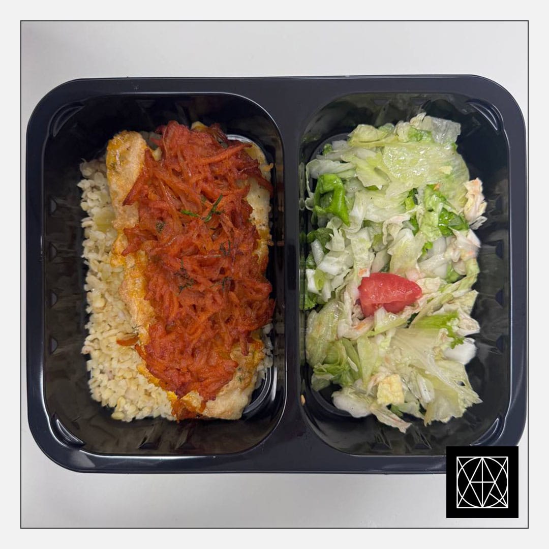 produkto kiekis: Jūros lydeka kaimiškai, užkepta morkomis ir svogūnais, pateikiama su bulguro rizotu ir šviežiomis salotomis