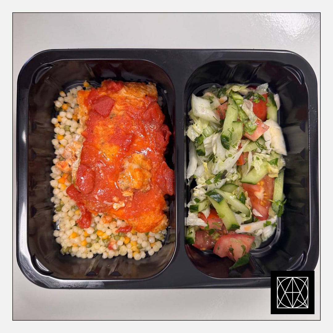 Jūros lydeka su pomidorų padažu, pateikiama su kuskusu ir šviežiomis salotomis