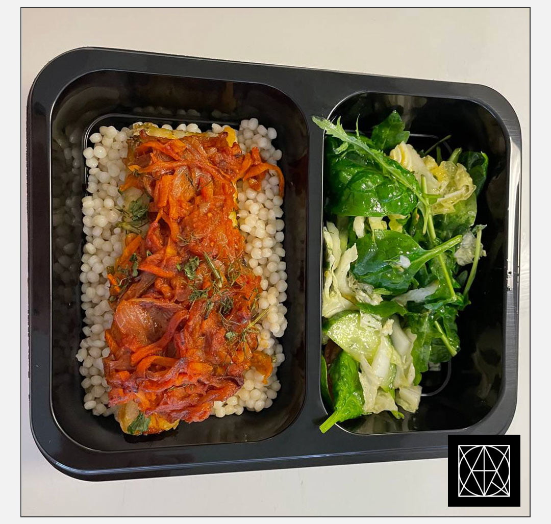 Jūros lydeka, užkepta morkomis ir svogūnais, pateikiama su perliniu kuskusu ir šviežiomis salotomis