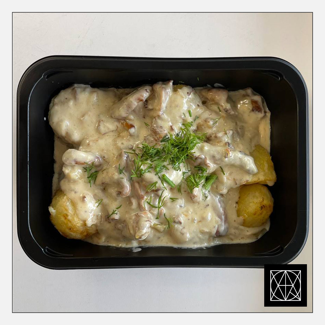 Keptos bulvės su voveraitėmis, su saldžios grietinėlės padažu, pagardintu krapais