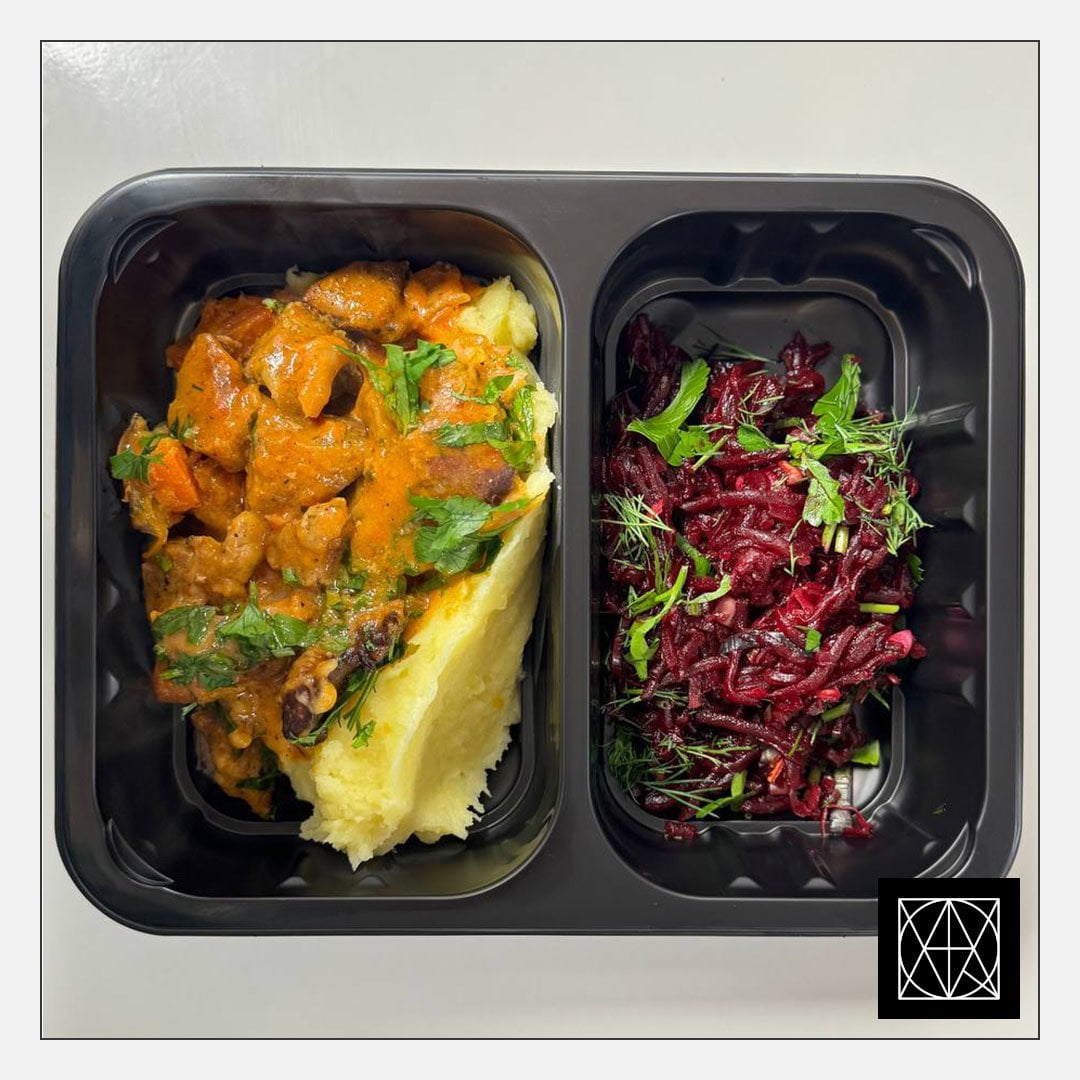 Kiaulienos guliašas, pateikiamas su bulvių koše ir burokėlių salotomis