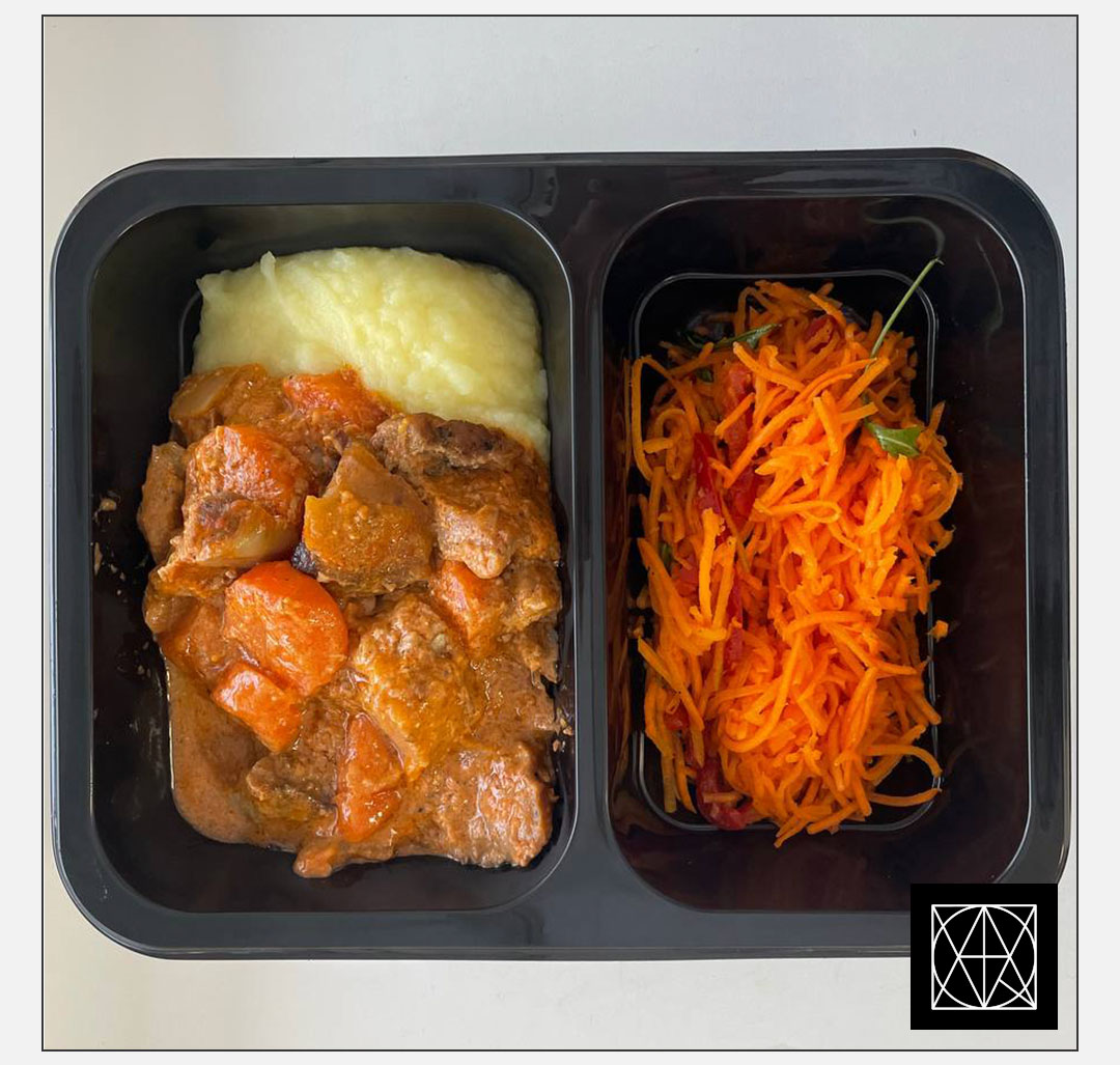 Kiaulienos guliašas, pateikiamas su bulvių koše ir korėjietiškomis morkų salotomis