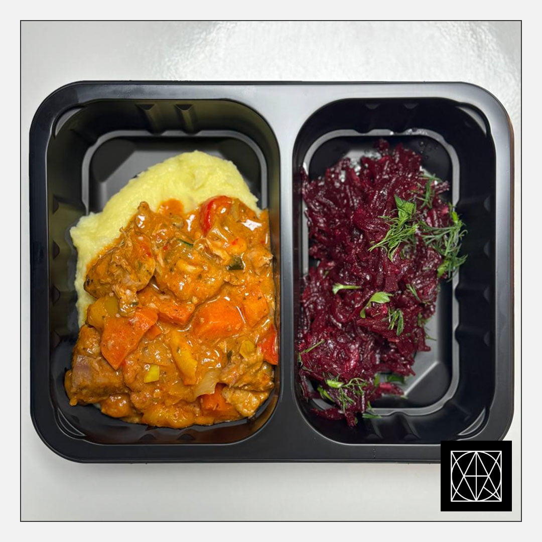 Kiaulienos guliašas su daržovėmis, pateikiamas su bulvių koše ir burokėlių salotomis
