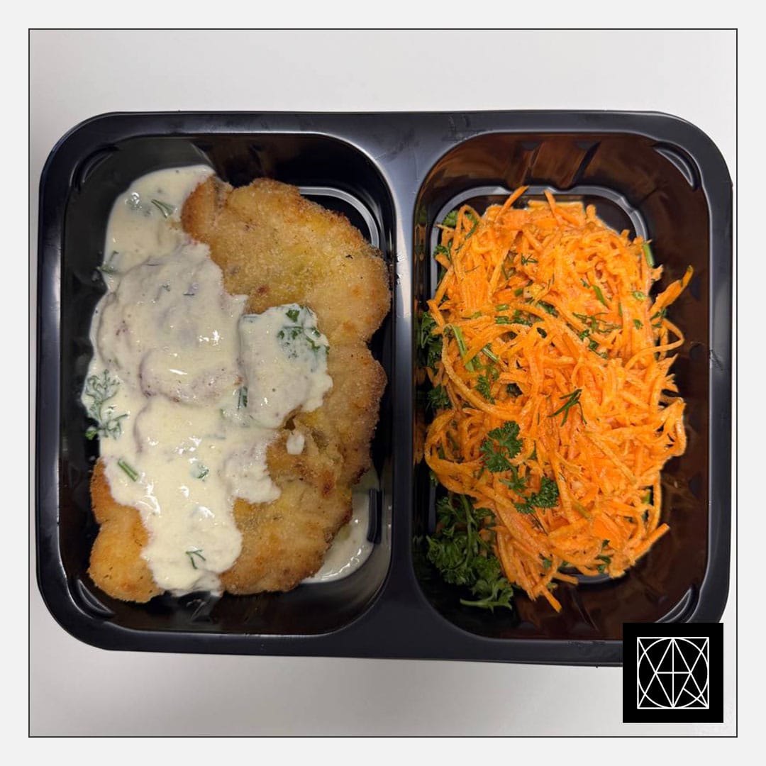 Kiaulienos karbonadas su sūrio padažu, pateikiamas su sviestine bulvių koše ir morkų salotomis, gardintomis majonezu