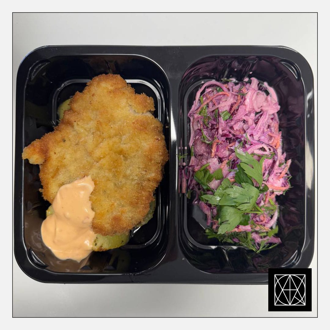 Kiaulienos karbonadas su saldžiai aštriu padažu, pateikiamas su keptomis bulvėmis, gardintomis kmynais ir „Coleslaw“ salotomis