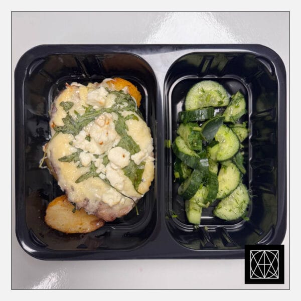 Kiaulienos kepsnys, užkeptas gražgarstėmis ir feta, pateikiamas su keptomis bulvėmis ir šviežiai raugintais agurkais
