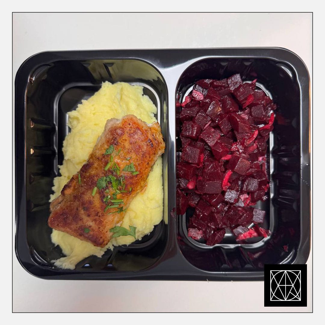 Kiaulienos nugarinė, įdaryta džiovintais pomidorais ir sūriu, pateikiama su sviestine bulvių koše ir burokėlių salotomis