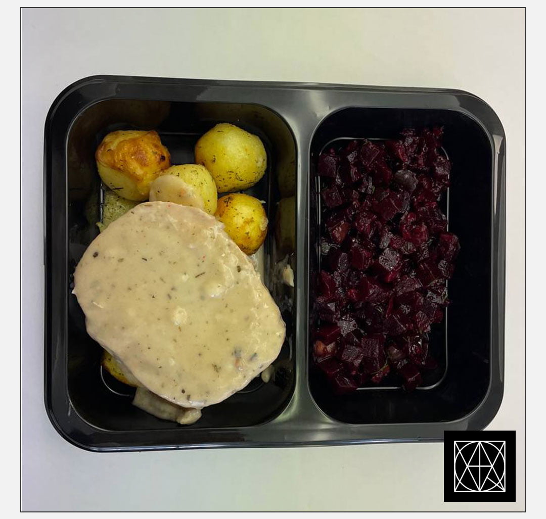 Kiaulienos nugarinės kepsnys, įdarytas feta, gražgarstėmis ir saulėje džiovintais pomidorais, pateikiamas su keptomis bulvėmis ir burokėlių salotomis