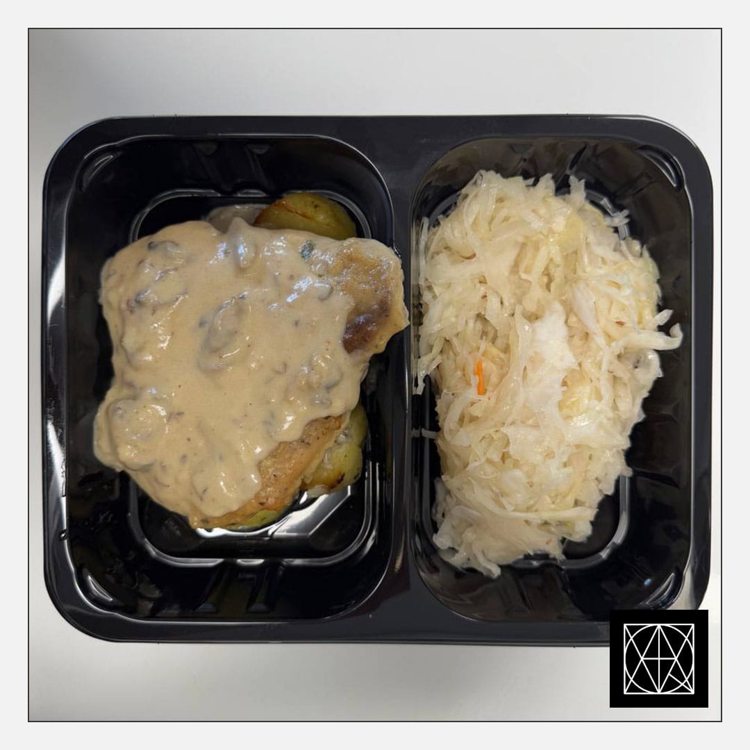 Kiaulienos nugarinės kepsnys su pievagrybių padažu, pateikiamas su keptomis bulvėmis, gardintomis kmynais ir mūsų raugintais kopūstais, gardintais aliejumi ir svogūnėliais