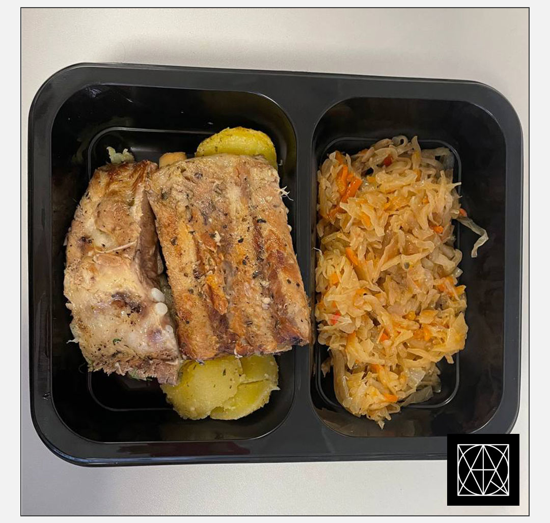 Kiaulienos šonkauliukai su keptomis bulvėmis ir troškintais kopūstais