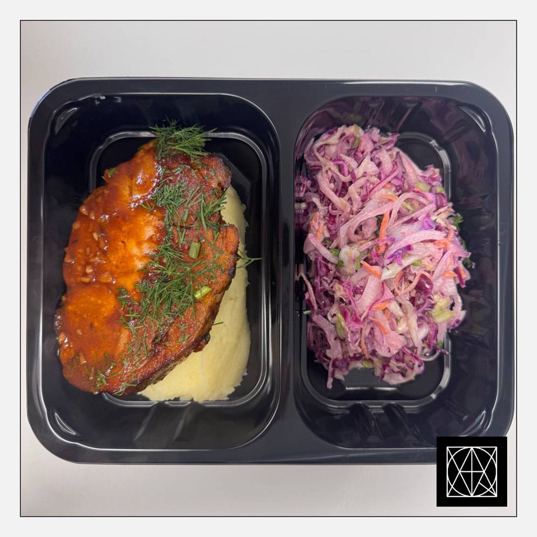 Kiaulienos sprandinė su BBQ padažu, pateikiama su bulvių koše ir „Coleslaw“ salotomis