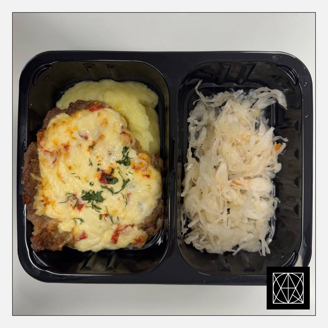 Kiaulienos sprandinė, užkepta čoriso dešra ir sūriu, pateikiama su bulvių koše ir mūsų raugintais kopūstais, pagardintais aliejumi ir svogūnėliais