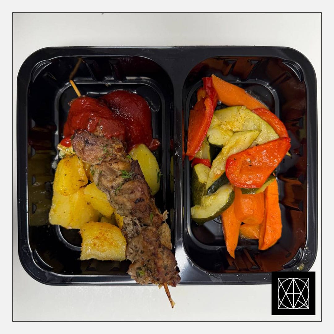 Kiaulienos sprandinės vėrinukas su pomidorų padažu, pateikiamas su keptomis bulvėmis ir karštomis daržovėmis