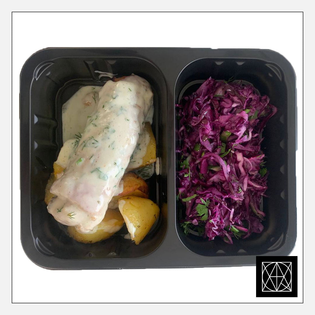 Kiaulienos suktinukas su šonine ir sūriu, pateikiamas su keptomis bulvėmis, gardintomis kmynais ir mėlynųjų kopūstų salotomis, gardintomis agurkais